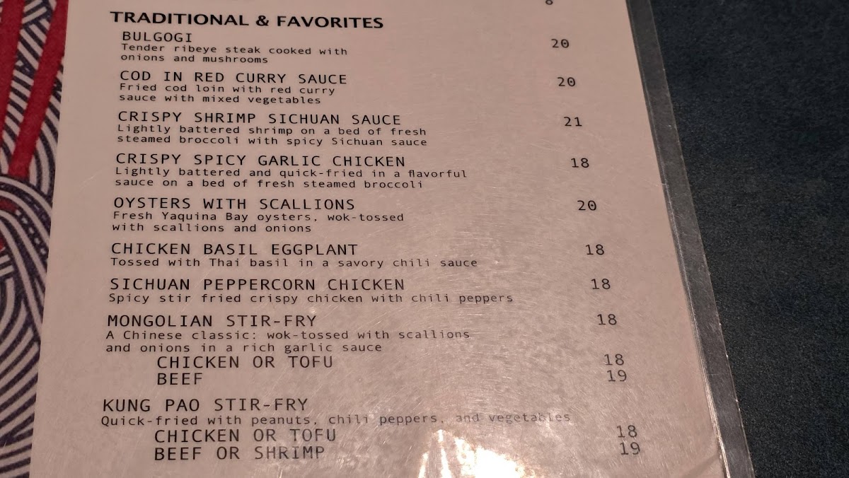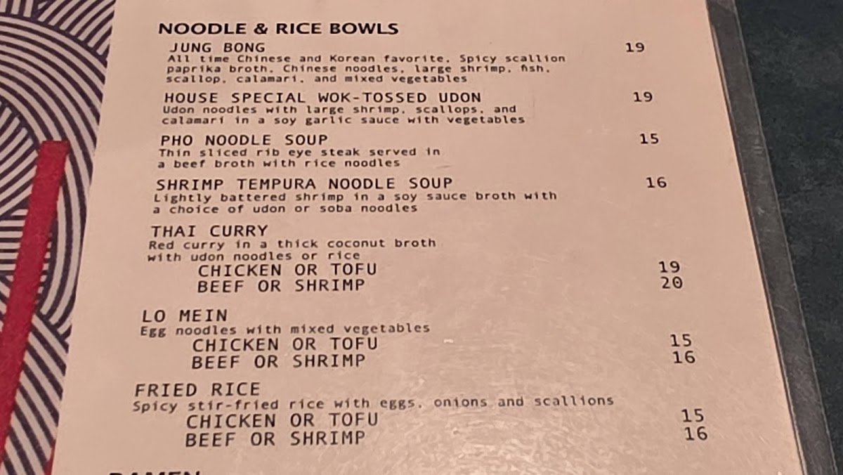 You’ll find a variety of noodle soups like Pho and Spicy Miso Ramen alongside hearty plates such as Rib Eye Bulgogi and Bibimbap. Light starters like potstickers and seaweed salad complement larger meals nicely, while flavorful dishes like Seafood Pancake and the house special “Jung Bong” Spicy Seafood Broth bring a bit of spice and depth. For drinks, choices range from traditional Thai tea to local and Asian beers, creating a balanced dining experience that pairs well with the diverse menu.